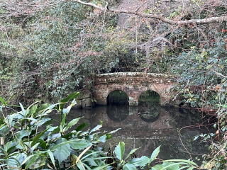 深い緑の木立に赤いレンガのアーチ形の眼鏡橋が映えます。橋の名は「千歳橋」だそうです。