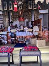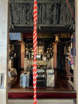 中央の間に弘法大師が祀られ、お手綱が回向柱と鐘楼に結ばれています。右の間にも大師像が