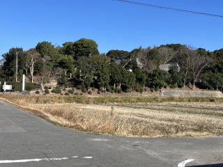 の知多奥田駅が見えています。その右手にあるこんもりとした森がお寺でしょう。右の丘の上にあるのが