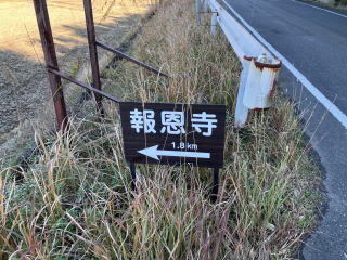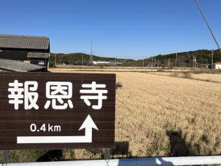 2kmほど歩くと正面に「卍報恩寺」の看板が立つT字路がありここを右折します。看板の向こうに名鉄