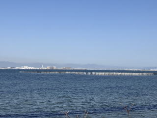 連絡橋の右側には常滑に市街地があります。今日はあそこまで歩きます。直線距離で10kmくらい