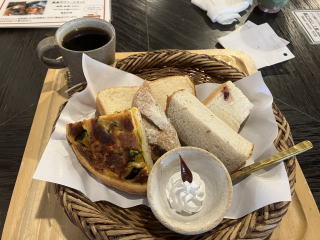 入口にお店がありましたので迷わず飛び込みました。パン工房のお店でパンのセットのコースが