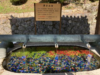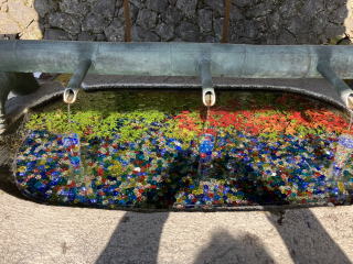 仁王門をくぐると、左手に手水舎があります。花手水舎という、水桶に色とりどりのガラス玉や、モミジ