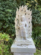 その池の後ろに不動明王像が置かれていました。池越しに十三重石塔が見えています。