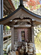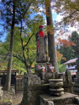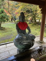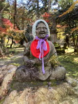 手水舎の奥に面白い像がありました。ひょうきんなお顔立ちのお地蔵さまが、赤い直垂とピンクの