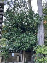 その左奥に「はがきの木」があります。現在私たちが使っている郵便はがきの語源になった物です。