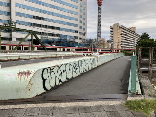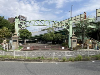 写真の通りいささか残念な姿になっています。隣の鉄橋を京急の電車が走っています。この鉄橋の