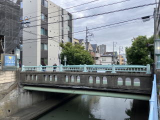 この橋の上から昔は江戸湾が見えたそうです。ここは高縄手といわれた高台の場所です。右手は