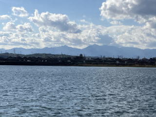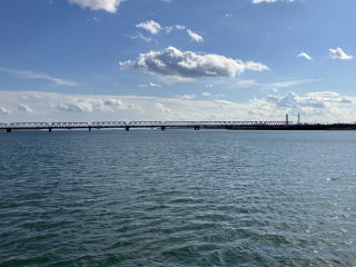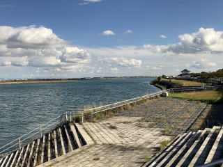 堤防に上がると幅広い揖斐川と長良川が伊勢湾に流れているのが見えます。川幅は1km以上ある