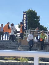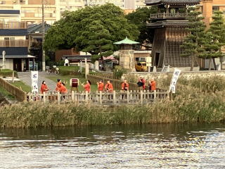 前方に熱田湊港が見えてきました。「堀川太鼓」というグループが歓迎の大太鼓を打ち鳴らしていて