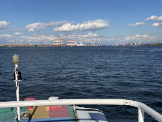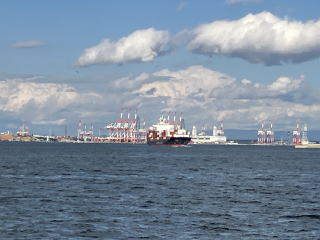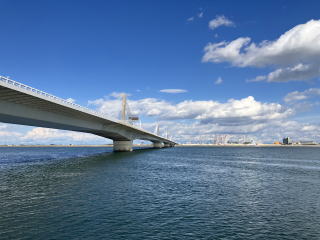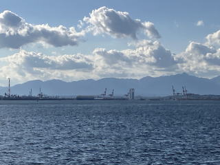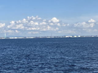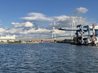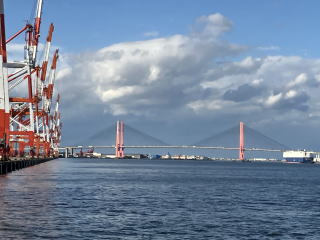高潮防波堤を越えて名古屋港の中に入ると、荷揚げ用のクレーンや停泊中の大型貨物船を見かけ