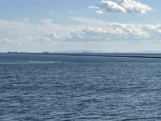 前方に高潮防波堤が見えてきました。あそこを過ぎると名古屋港に入ります。