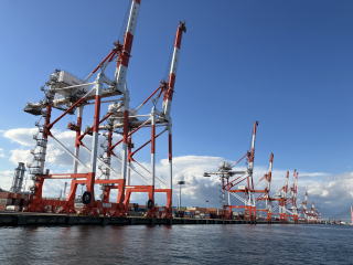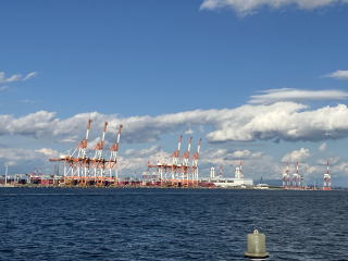 名古屋港に入港 クレーン群と貨物船