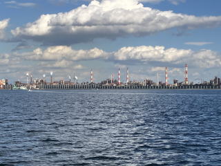 したことで有名な製鉄工場もありました。荷下ろししているコンテナ船などが見えます。ここが日本経済