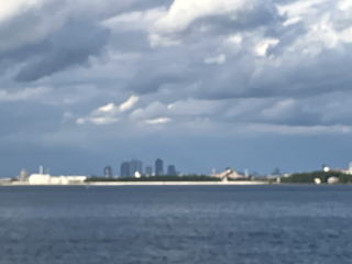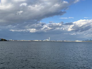 稲永ふ頭にある10号地灯台を左手に過ぎると、正面に名古屋ガーデンふ頭が見えてきます。